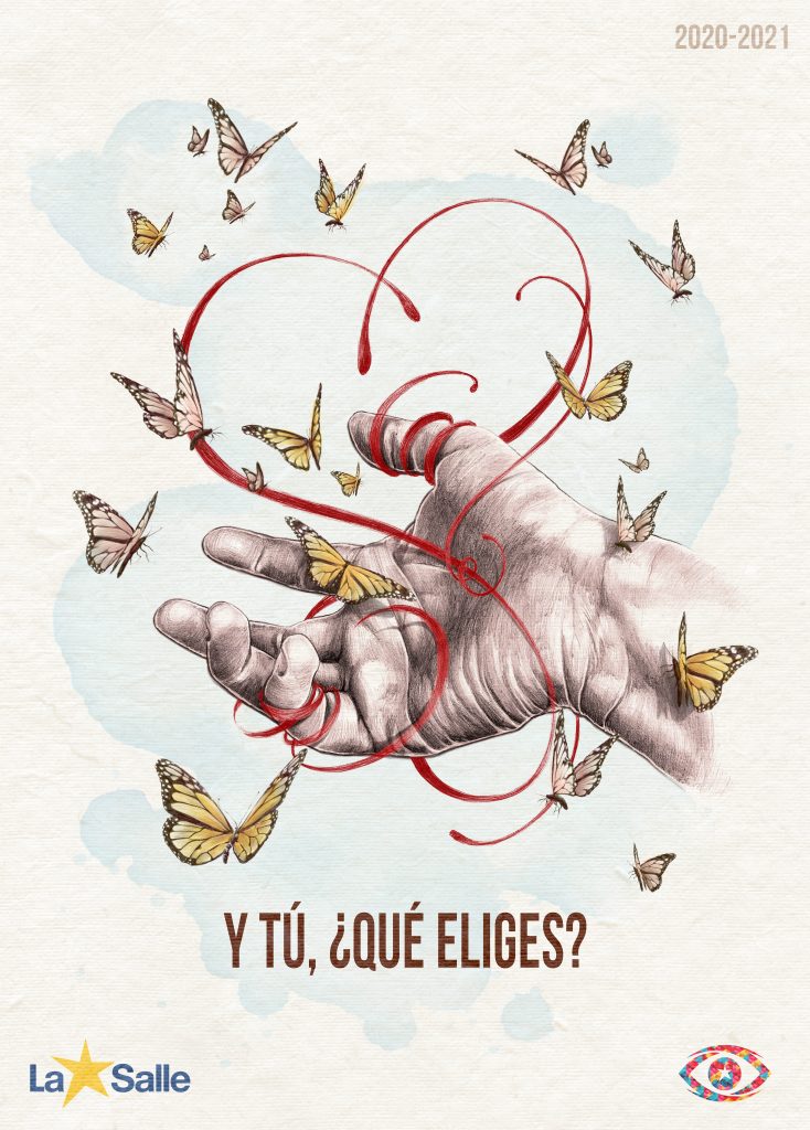 El cartel presenta el núcleo del lema del curso que viene: la responsabilidad. Se trata de provocar en la comunidad educativa el descubrimiento y la oportunidad que la vida nos ofrece de elegir cómo llenarnos o vaciarnos, de vivir abiertos o ensimismados, y como dicho descubrimiento llena nuestro interior. No se trata de una responsabilidad moralista, que nos lleve a escoger entre el bien y el mal, se trata de descubrirnos en la libertad compartida. Ser persona es eso. En los escritos de La Salle, aparecen frecuentemente palabras como fidelidad, perseverancia, exigencia. Para el Fundador, esta exigencia basada en valores profundos, los del Evangelio, era inherente a su vida y siempre huyó de una superficialidad que decayera poco a poco en negligencia.